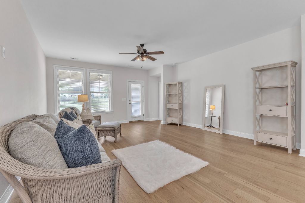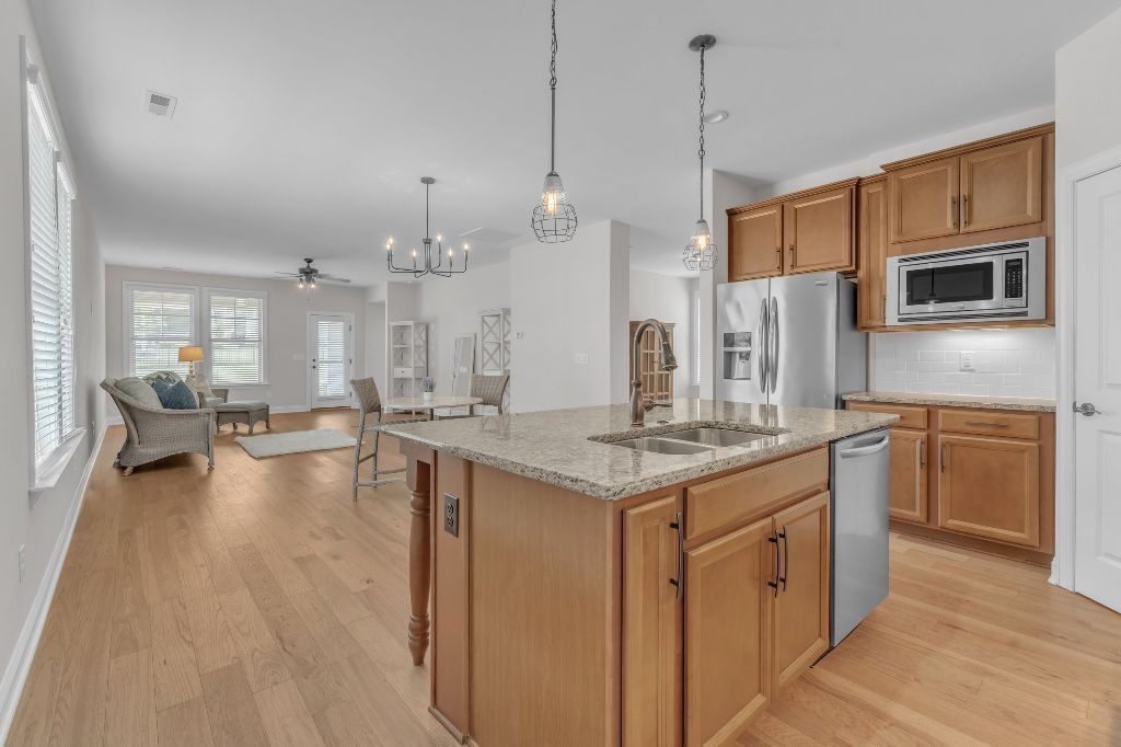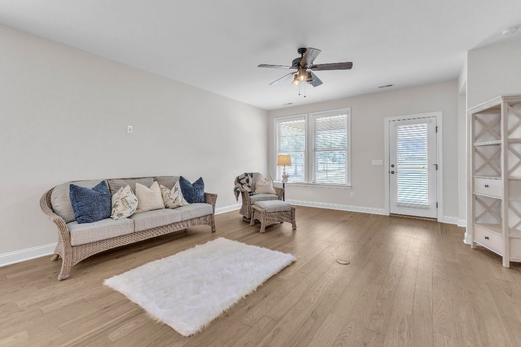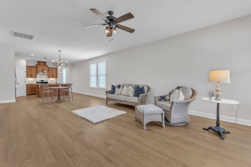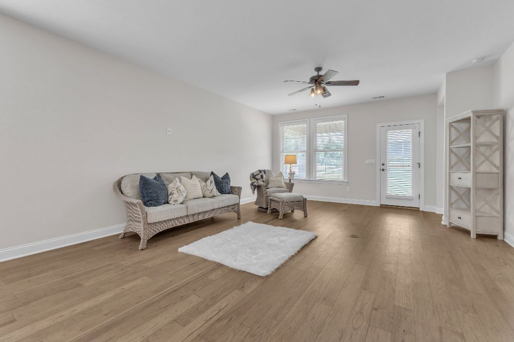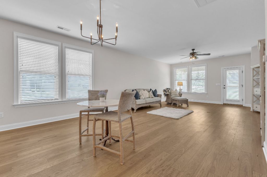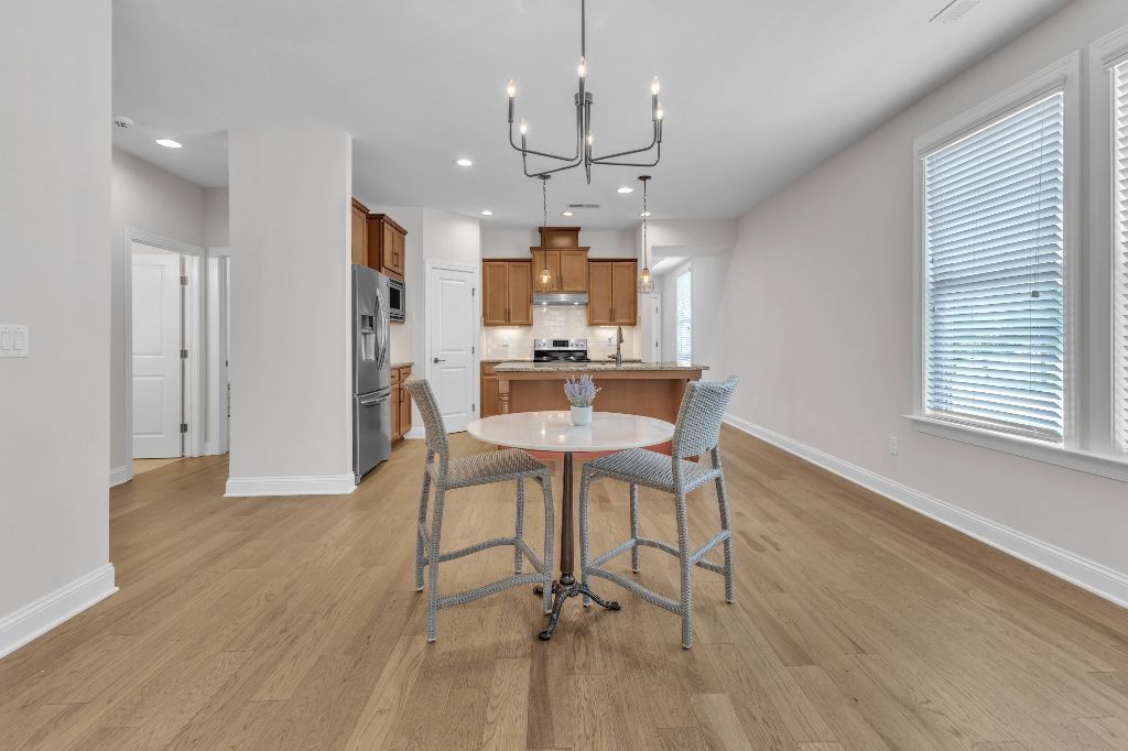 Charming 2-Bedroom Ranch with Office in Award-Winning 55+ Community – Creekside at Bethpage!Welcome to easy living in this refreshed 2-bedroom ranch with a dedicated office, located in the sought-after Creekside at Bethpage 55+ community! Step inside to discover brand new Charlotte Hickory wood flooring throughout the main living areas and a bright, open-concept floorplan that’s perfect for both relaxing and entertaining. At the heart of the home is a gourmet kitchen featuring granite countertops, a stunning tile backsplash, abundant cabinetry, matching stainless steel appliances, an oversized walk-in pantry, and convenient counter bar seating. Thoughtfully designed, the kitchen seamlessly connects to a spacious living and dining area that’s bathed in natural light from a full wall of windows. Retreat to the large Primary Suite, which boasts a tray ceiling, large bay window, ample room for a sitting area, and a luxurious en-suite bath with a glass-tiled shower and built-in bench, dual vanity with granite countertops featuring drawer storage, and a generous walk-in closet. On the other side of the home you will find a private guest bedroom and full bath, along with a versatile office space that includes a closet and can easily function as a third bedroom with the simple addition of doors. Enjoy peaceful outdoor living with a rocking-chair front porch and a covered back patio that overlooks scenic walking trails. Just a short stroll to the community clubhouse, where you’ll enjoy resort-style amenities including a pool, fitness center, pickleball, planned social events and more. Unbeatable location—minutes to I-40, I-540, Brier Creek shopping, dining, medical facilities, and RDU Airport. This home truly offers the best in comfort, convenience, and community. A must-see!