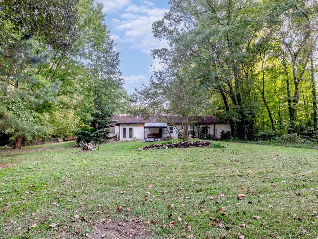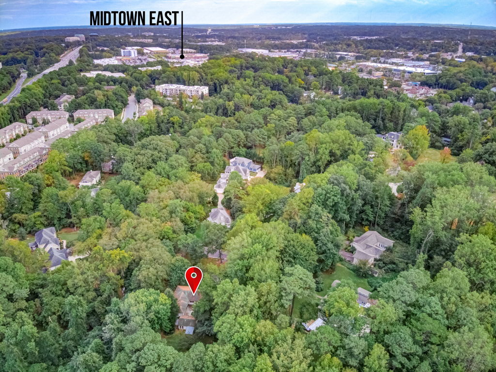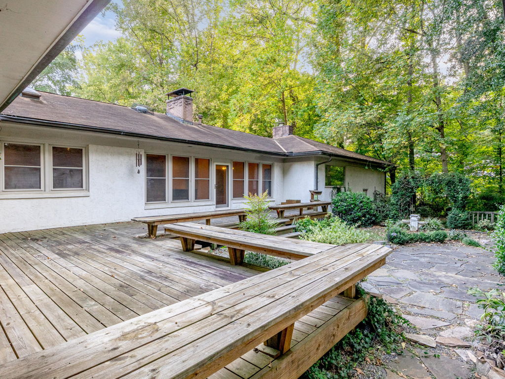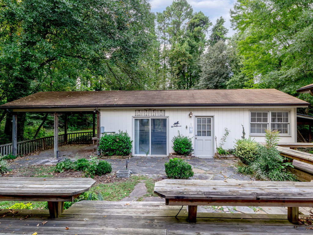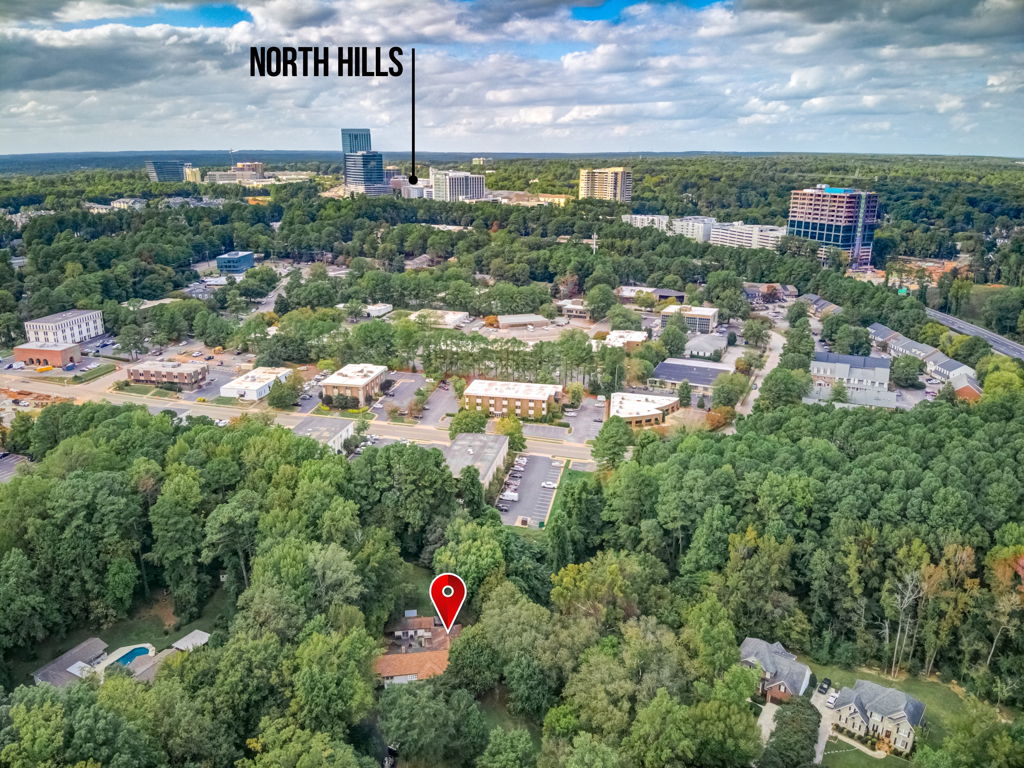 RARE Single Story Living with ADU on 1.38 acres Inside the Beltline! Beautifully landscaped home in a serene setting nestled between North Hills & Midtown East – just minutesf rom both. Turn this home into your dream home – the possibilities are endless!!! Enter the home to hardwoods in all of the main living areas and a wall of windows in the living room overlooking the large back deck and patio. The living room features a Jotul wood burning fireplace & built-ins. From the living room the kitchen & dining room are to the left and you will also find a huge family room with another fireplace and large windows as well. On the other side of the home, the large primary bedroom features a sliding glass door onto the back deck, a sizable bathroom and 2 walk-in cedar closets. The other 2 bedrooms are a decent size -1 w/walk-in closet. Don’t miss the oversized garage! ADU is offset from the back patio and features a studio space, full bathroom, stackable washer/dryer, and full kitchen.