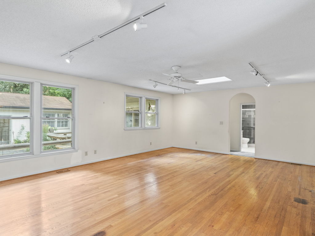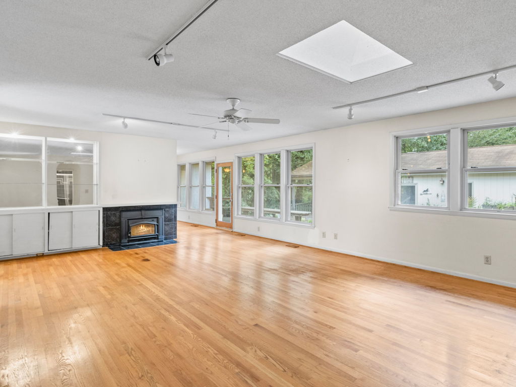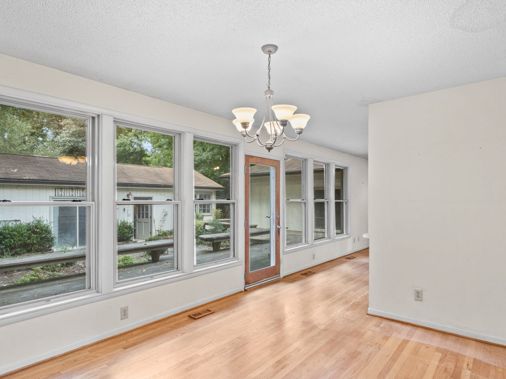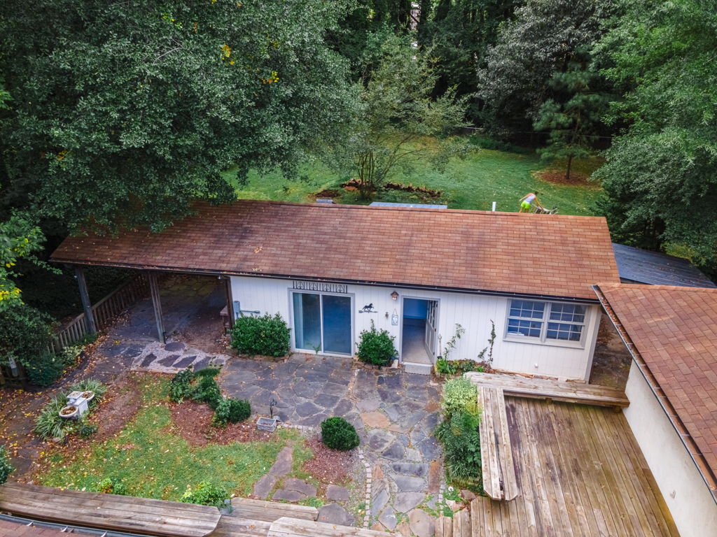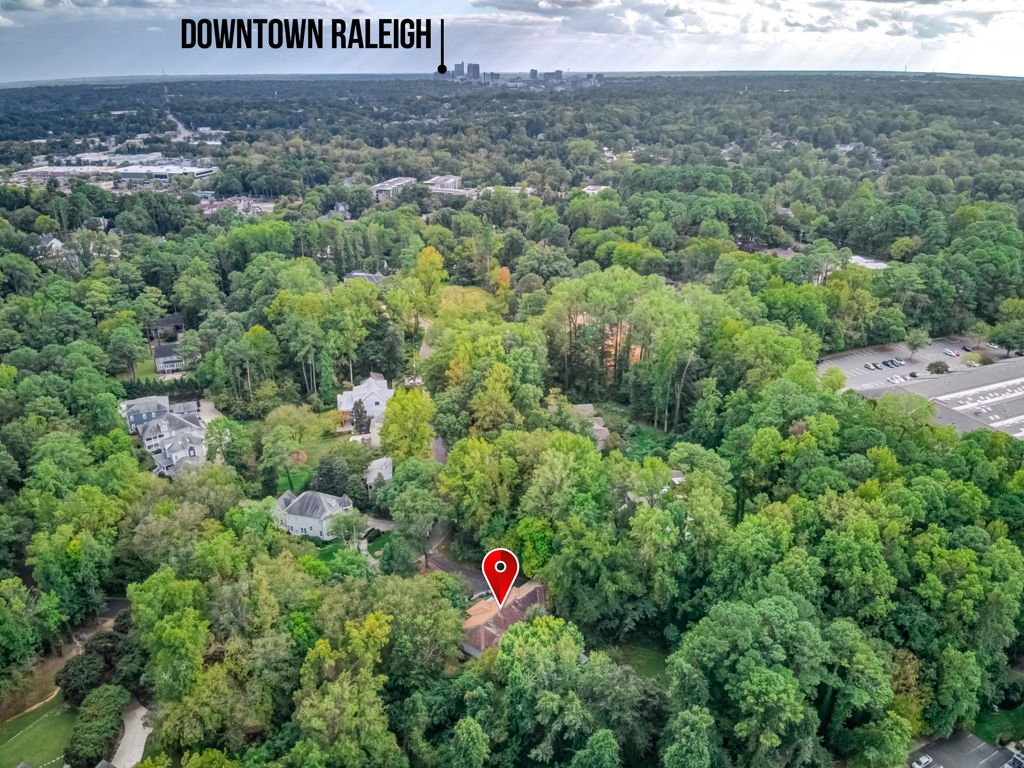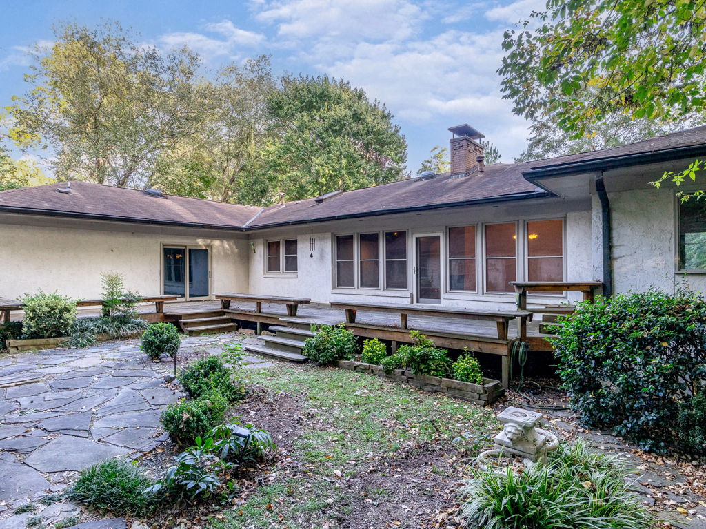 RARE Single Story Living with ADU on 1.38 acres Inside the Beltline! Beautifully landscaped home in a serene setting nestled between North Hills & Midtown East – just minutesf rom both. Turn this home into your dream home – the possibilities are endless!!! Enter the home to hardwoods in all of the main living areas and a wall of windows in the living room overlooking the large back deck and patio. The living room features a Jotul wood burning fireplace & built-ins. From the living room the kitchen & dining room are to the left and you will also find a huge family room with another fireplace and large windows as well. On the other side of the home, the large primary bedroom features a sliding glass door onto the back deck, a sizable bathroom and 2 walk-in cedar closets. The other 2 bedrooms are a decent size -1 w/walk-in closet. Don’t miss the oversized garage! ADU is offset from the back patio and features a studio space, full bathroom, stackable washer/dryer, and full kitchen.