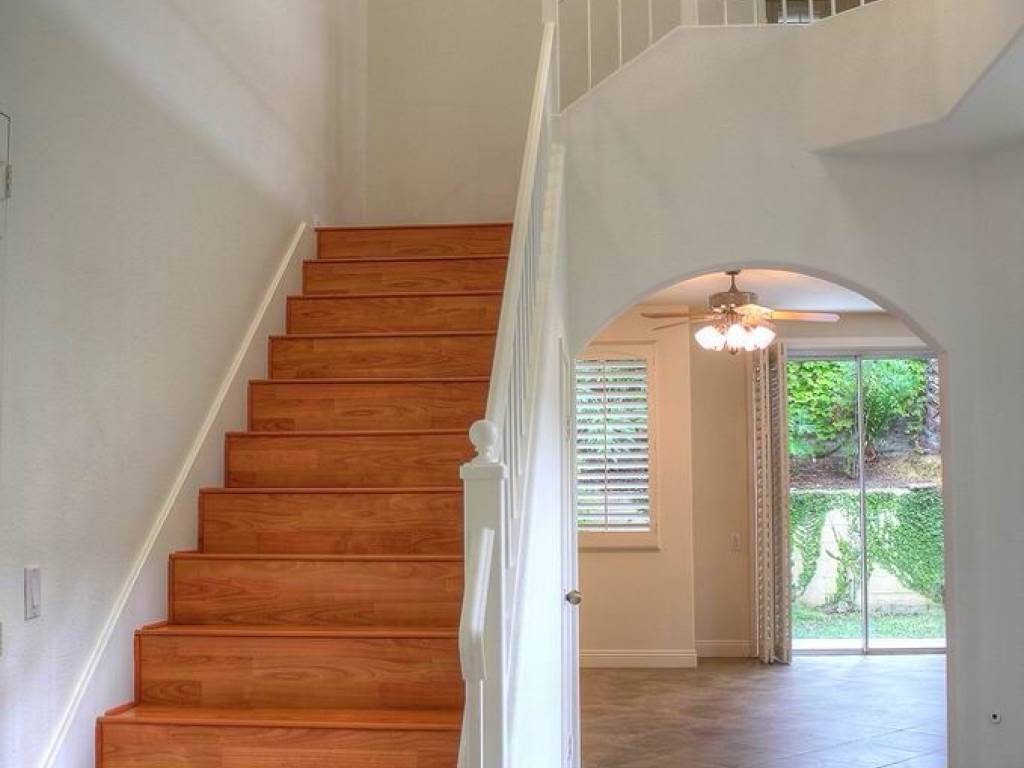 Bright, light, open floor plan in the beautiful Islands development. This detached home features 3 bedrooms plus a loft, 2 1/2 baths, unique 2-sided fireplace, skylights, plantation shutters, high ceilings, and no common walls. This largest floor plan also has a front yard and tropical, private backyard. Flooring is wood or tile, no carpeting.