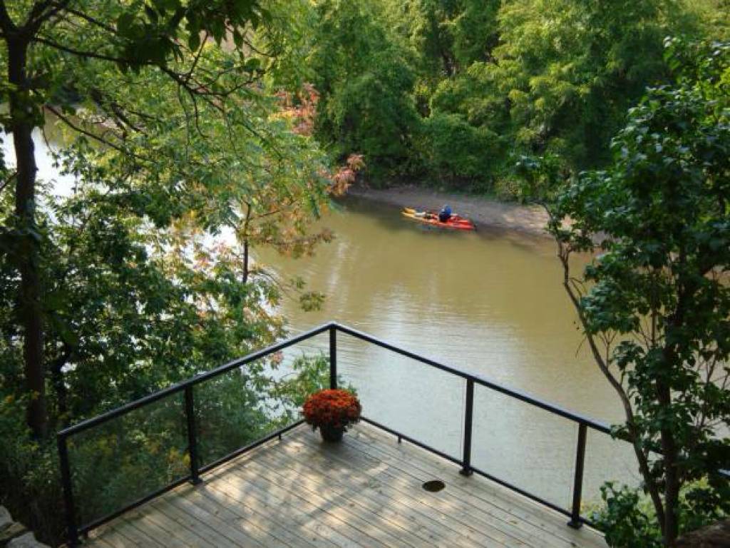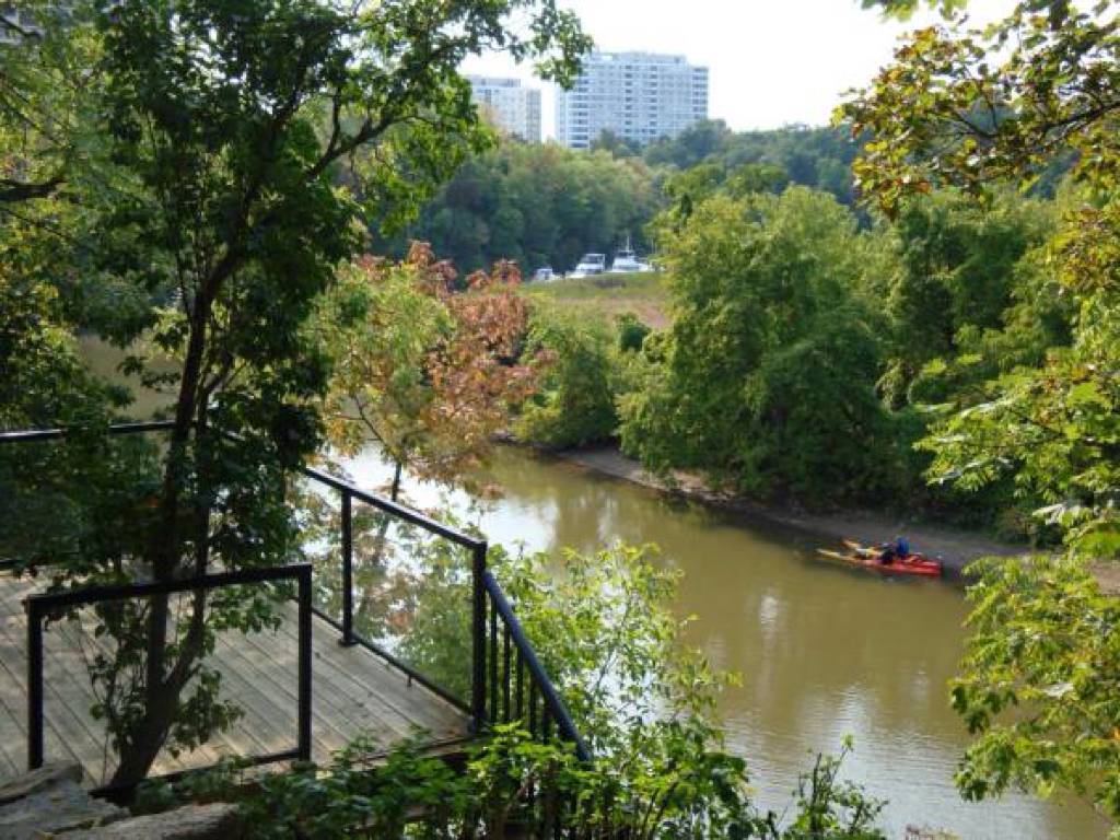Rare Offering: Live the Country Life Directly in Downtown Oakville! Totally renovated 2 bedroom home within 60 seconds of walking to all the great restaurants, coffee shops and theatre that downtown Oakville has to offer. Multi-tiered decks overlooking Sixteen Mile Creek at your back door step to allow you to enjoy the natural beauty like no where else! Watch as fish, beaver, deer and Olympic boaters paddle past. Put your own kayak or canoe in the water and leave right from your backyard! Brand new finishes top to bottom. New roof, electrical, plumbing, retaining wall. European imported designer kitchen with granite counter tops. A detached home with low maintenance landscaping and NO CONDO FEES on this freehold property! Views from every window. Relax in your spa-quality ensuite soaker tub and watch the river flow below! Heated floors on lower level with walkout to deck. Parking for 4 cars. A MUST SEE! .