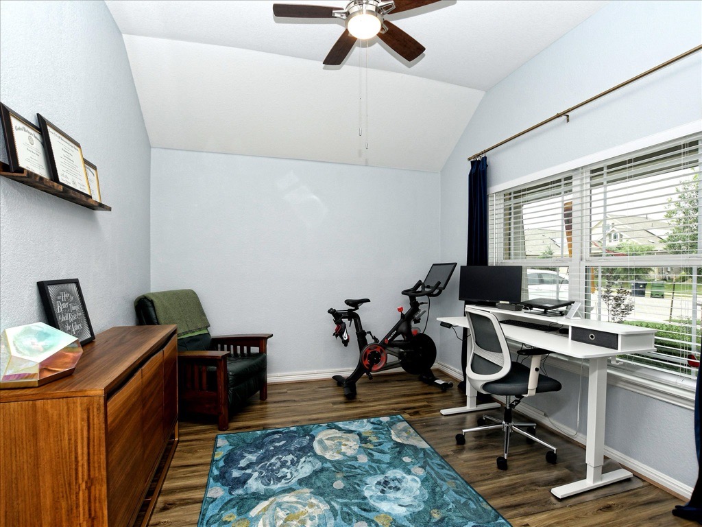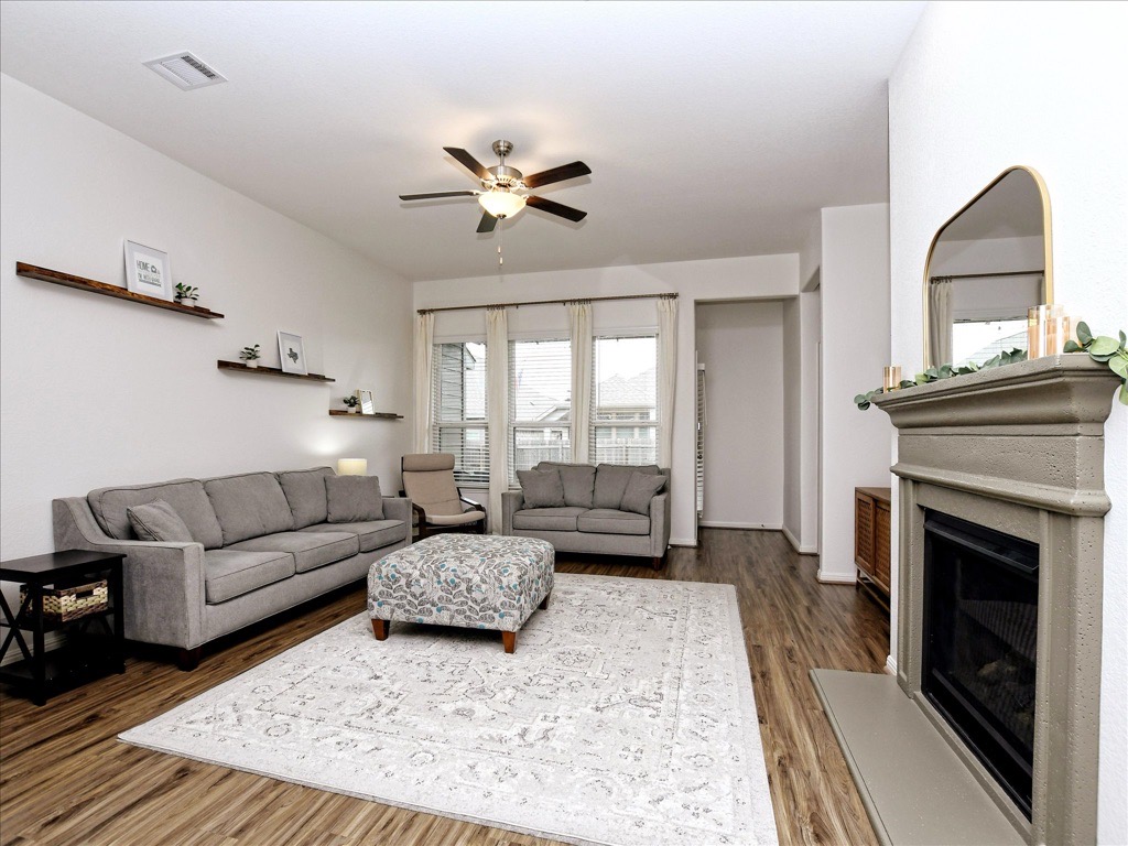 Super cute home in Santa Rita Ranch North. This single story floor plan with 3 bedrooms, 2 bathrooms and an office/study away from the bedrooms. The layout is a semi-open concept. The kitchen has upgraded stainless steel appliances (refrigerator conveys) and quartz counter tops. Primary suite has a huge walk in shower & large walk-in closet. Secondary bedrooms are sizable & separated from the primary. The living space boasts a gas fireplace. Recent interior paint & upgraded carpet/pads. A covered patio and large backyard are excellent for entertaining. Santa Rita Ranch amenities include pools, splash pads, clubhouse & activities for all. Welcome home! Assumable 2.75 VA loan for qualified veterans.