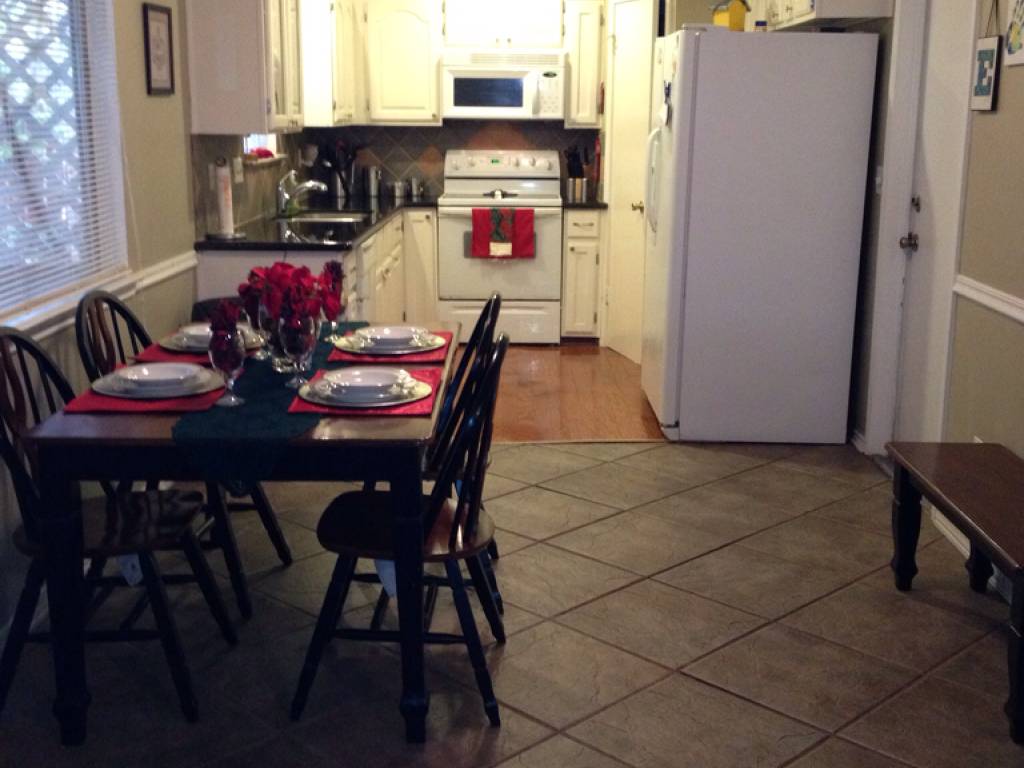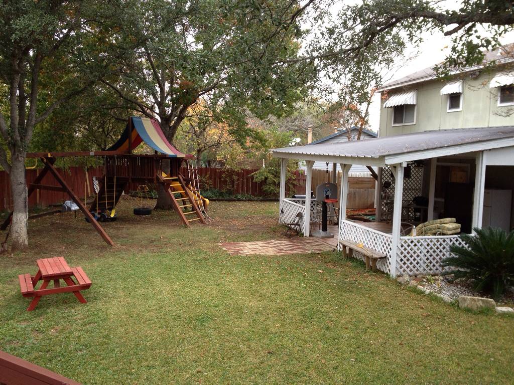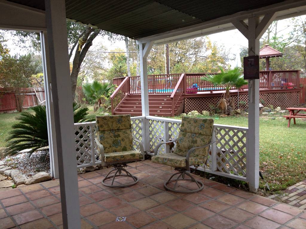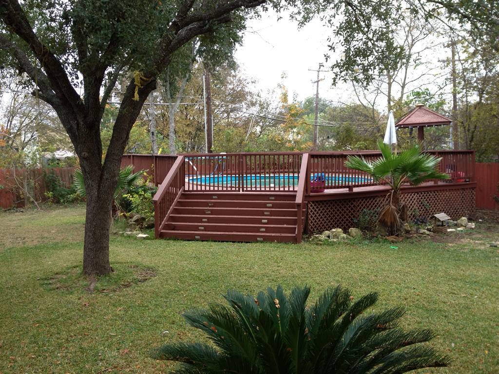 This cozy home is ready for entertaining. Open living area with fireplace opens to eat-in kitchen with granite counter tops. All bedrooms upstairs. Baths have ceramic tile. Double French doors open to the extra large covered patio. Above ground pool surrounded by a deck with tropical plants and trees. Huge private lot backs to a greenbelt. Mature trees will shade your friends and family. This home screams “come over for a bar-b-q pool party”!